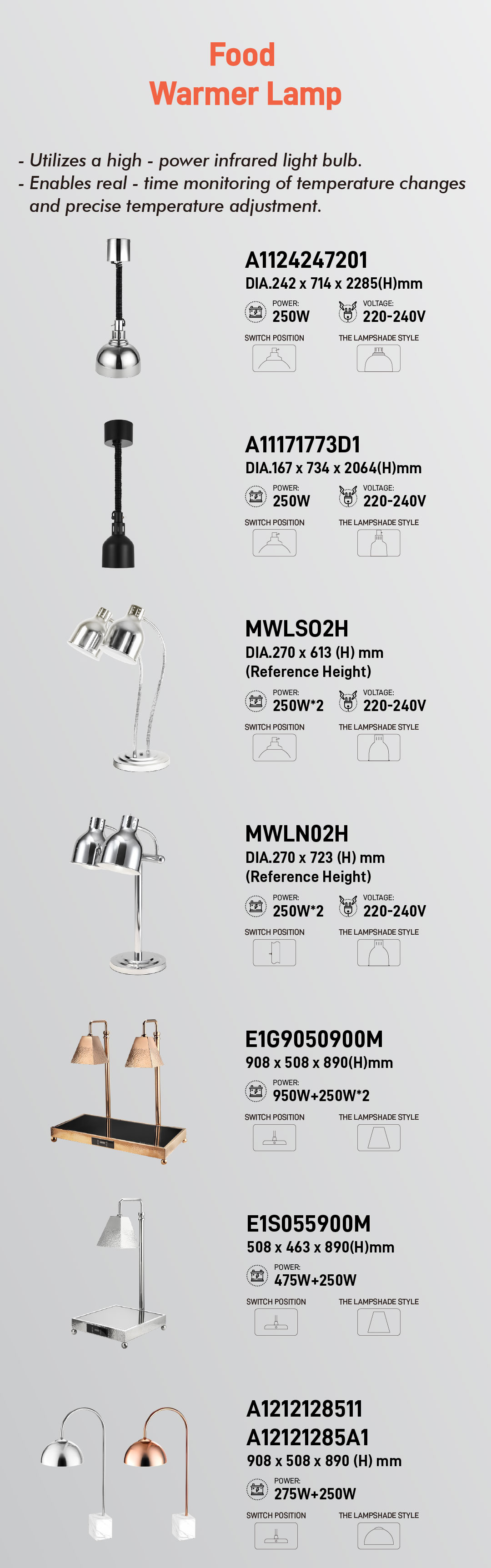 наша остання серія ламп для підігріву їжі — розроблена для того, щоб ваші фірмові страви доставлялися до столу саме такими, якими вони заплановані: гарячими, свіжими та приголомшливими.